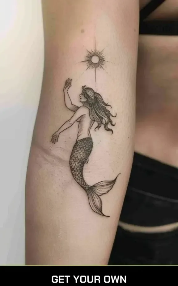 A mermaid and sun tattoo combines the beauty of the sea with the warmth of the sun. This design can symbolize harmony between the elements, and it often features vibrant colors and dynamic compositions.