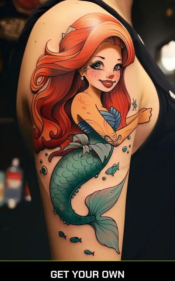 Cartoonish mermaid tattoos bring a sense of fun and nostalgia, often inspired by beloved animated characters. These tattoos can be vibrant and expressive, capturing the playful essence of mermaids in a more whimsical style.
