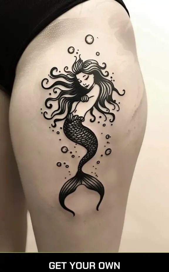 A mermaid surrounded by playful bubbles, creating a sense of movement and lightness. This design is perfect for a dynamic and lively tattoo.