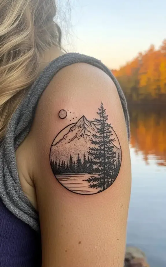 The placement on the upper arm allows for a detailed and expansive landscape. With trees in the foreground and mountains in the distance, this tattoo appeals to those with a spirit for exploration. It serves as a reminder of life s boundless possibilities and the beauty of the unknown.
