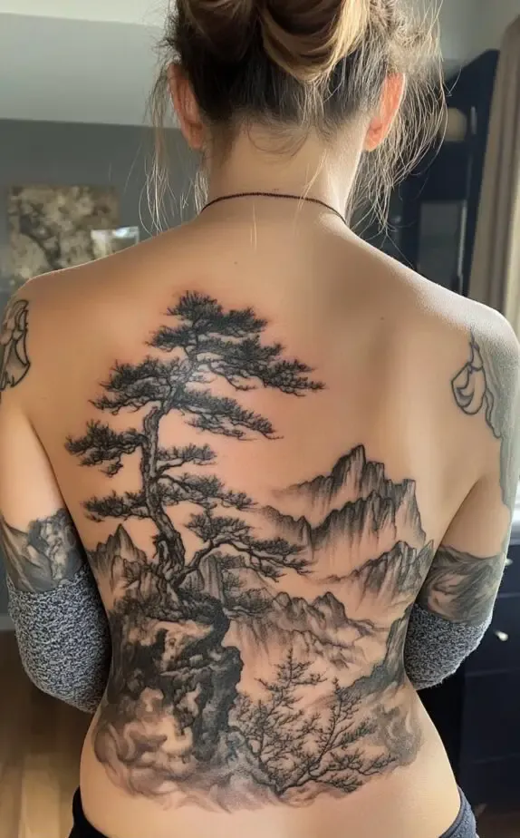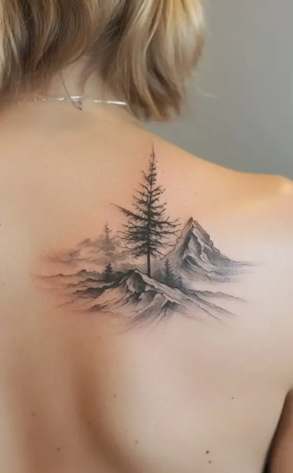 This back tattoo features a tall tree standing against a mountain backdrop, blending simplicity with elegance. The shading and fine lines create a soft, realistic effect, making it a perfect design for those who appreciate delicate artistry.