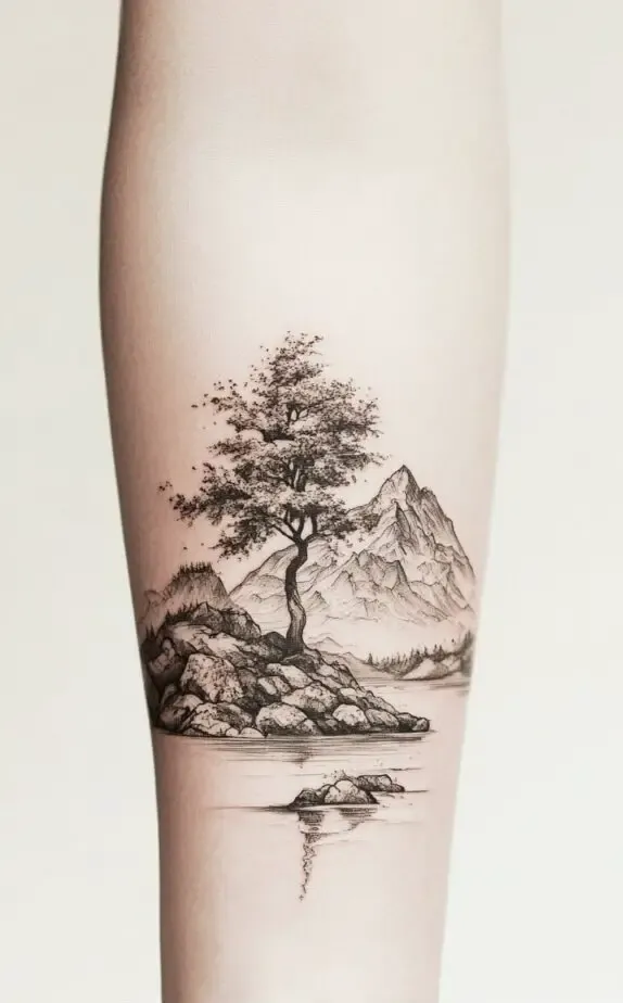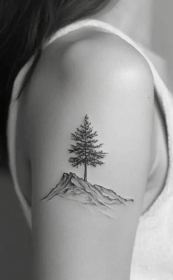 This tattoo highlights a single tree rooted in a mountain peak. It s a minimalistic yet impactful design that speaks to the spirit of resilience. The placement on the arm makes it visible yet subtle, perfect for those who prefer smaller tattoos with deep symbolism.