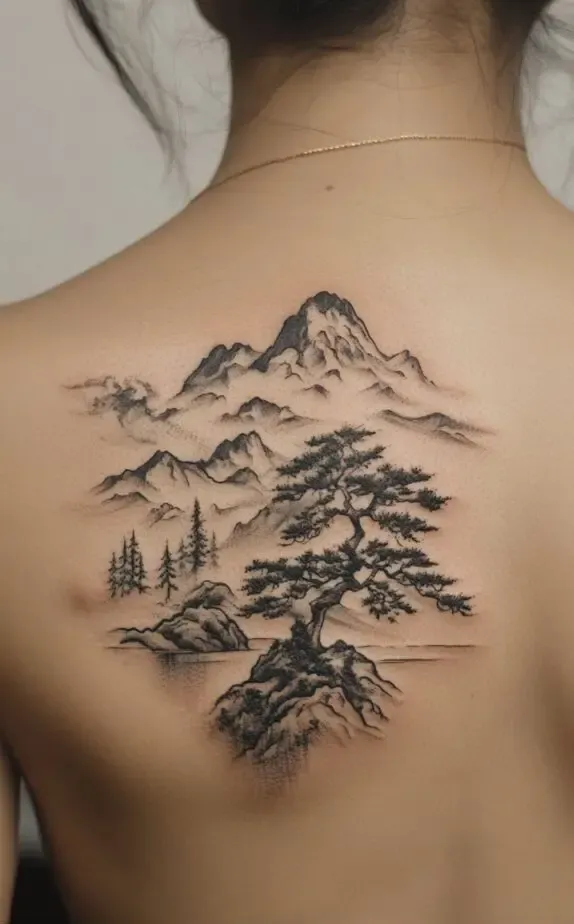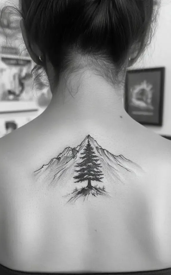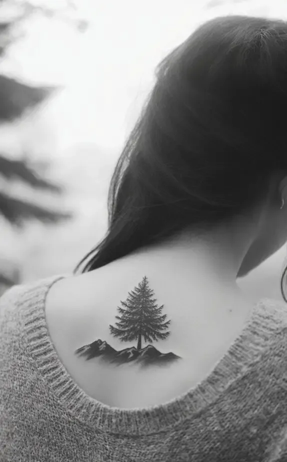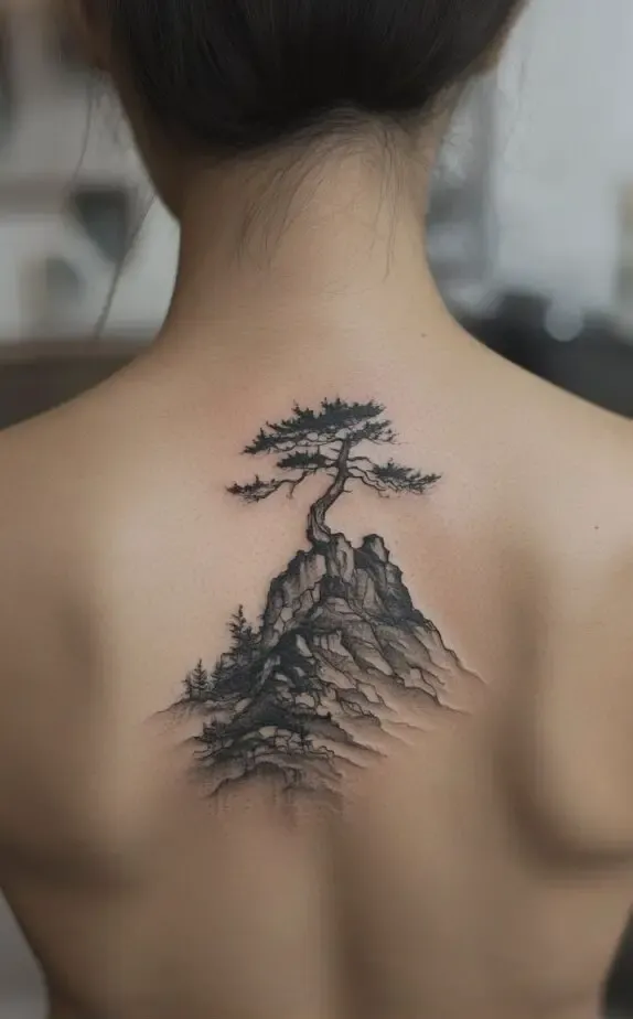 This minimalist design focuses on a single tree rooted in a mountain landscape. Positioned between the shoulder blades, it s a subtle yet powerful tattoo for those seeking simplicity. The solitary tree represents resilience and the strength to stand alone, making it meaningful for introspective individuals.