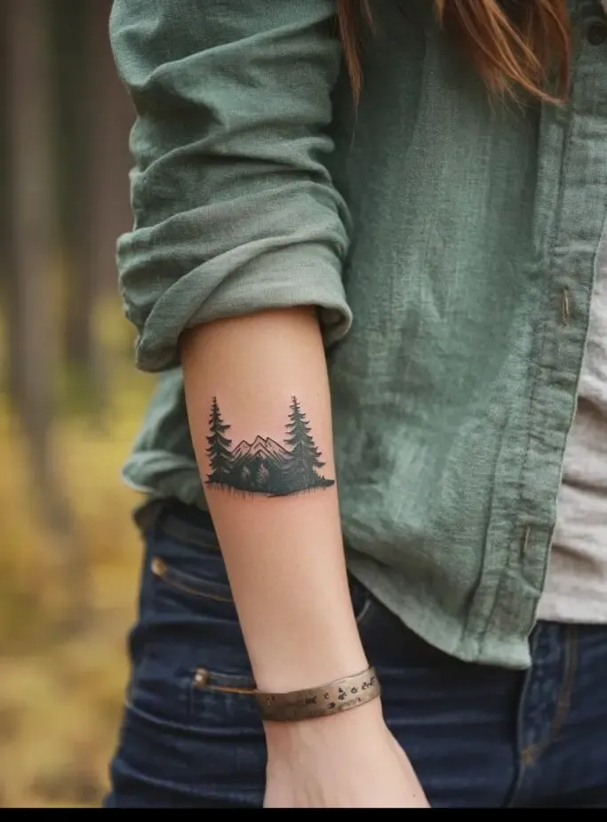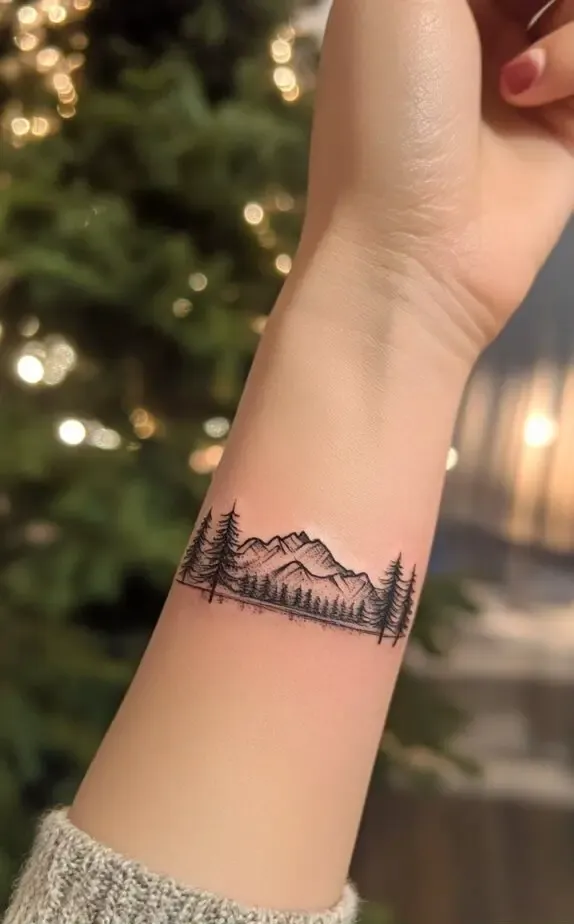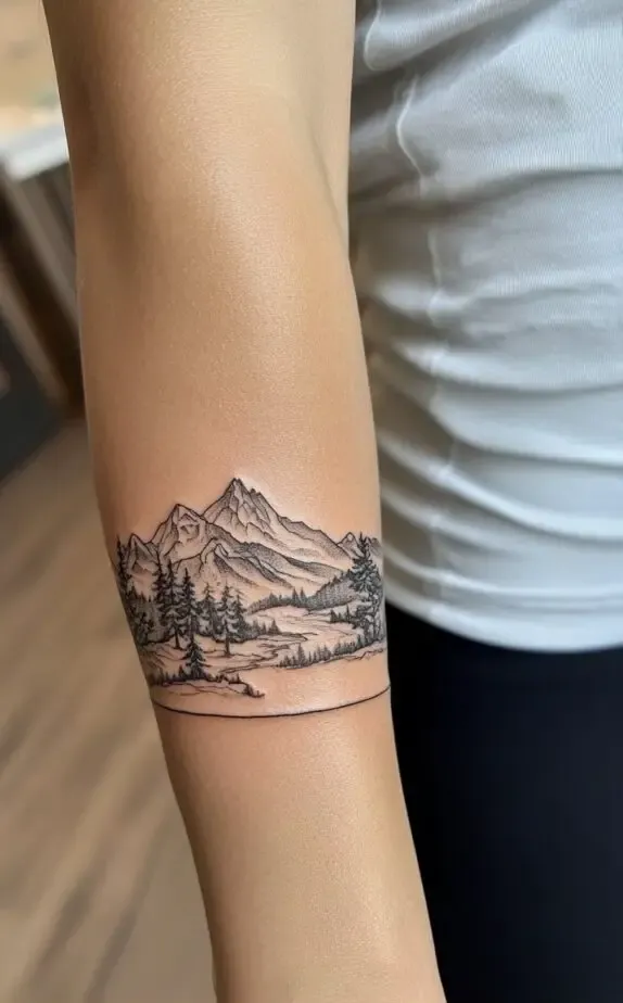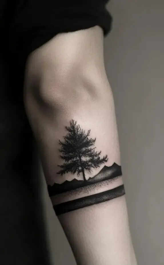 Placed around the arm, this tattoo creates a unique band effect, adding subtle elegance. The tree in the center represents balance and growth, while the mountains signify life s journey. This tattoo is ideal for those seeking a small, meaningful piece that reflects their love for nature.