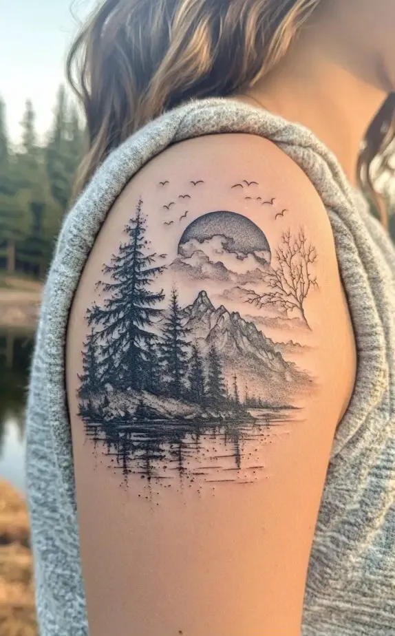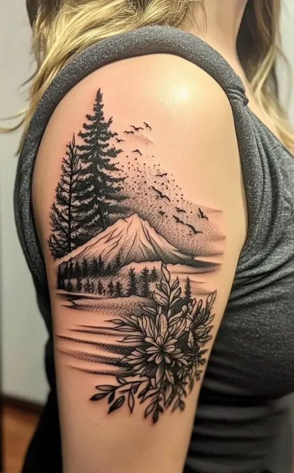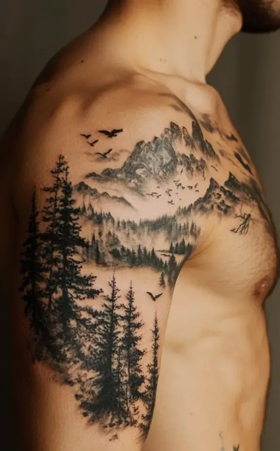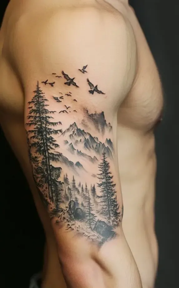 This tattoo stretches across the shoulder and upper arm, depicting a forest nestled in mountains. Birds soar above the treetops, adding a dynamic element to the otherwise calm scene. The expansive design is perfect for those looking for a more dramatic, detailed piece.