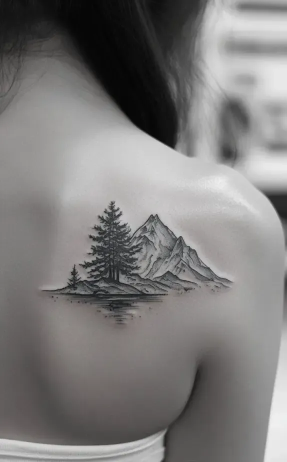 Placed on the shoulder blade, it s a semi-hidden piece that adds a sense of personal connection to the landscape. This tattoo is ideal for adventurers who appreciate the serenity of remote lakes and mountains. The reflection in the water enhances the realism and depth of the tattoo.