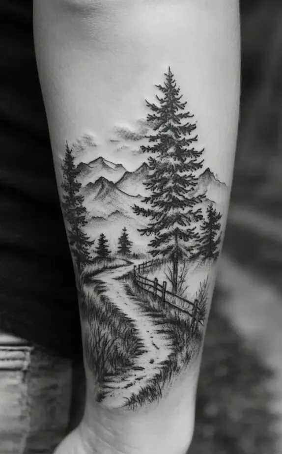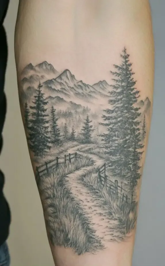 The detailed artistry in this tattoo, particularly the pathway and fencing, adds a rustic charm. It conveys a sense of escape from the hustle of daily life, making it ideal for free spirits and nature enthusiasts. This forearm placement keeps this connection to nature close at hand.
