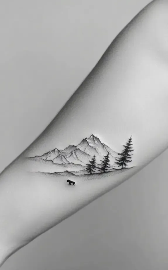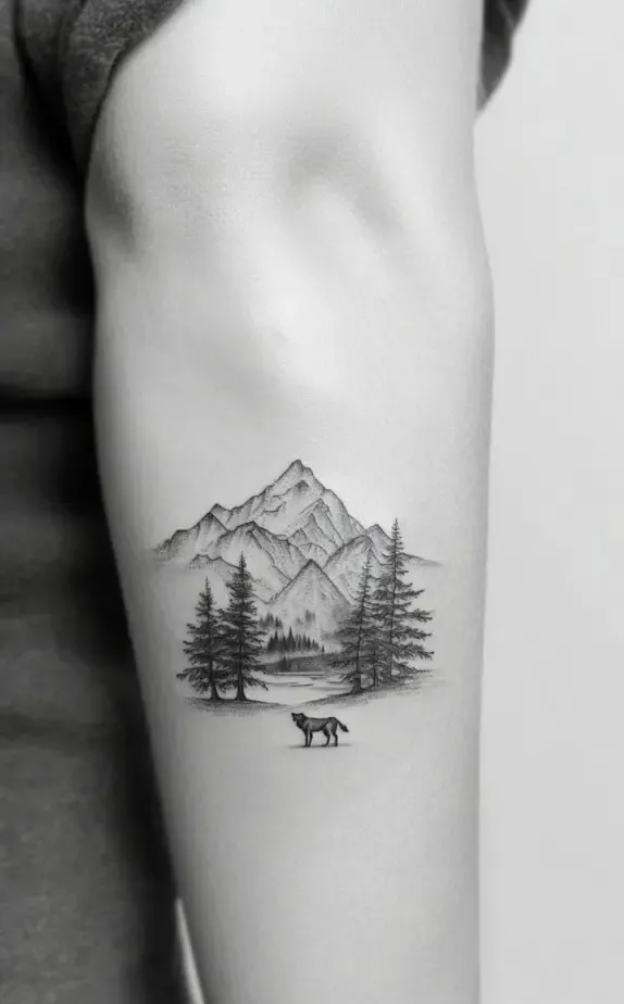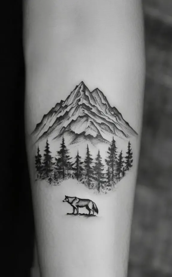 This tattoo features a prominent mountain range with a wolf standing beneath the trees. It s perfect for those who resonate with the spirit of wolves and admire the grandeur of mountains. The combination creates a feeling of solitude and strength, capturing the wild essence of nature.