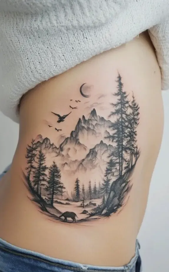Positioned on the ribcage, this tattoo presents a mountain and forest scene with a grazing animal in the foreground. The inclusion of a bear or deer adds a touch of wilderness and strength. The crescent moon and birds create a serene atmosphere, making it perfect for nature enthusiasts.