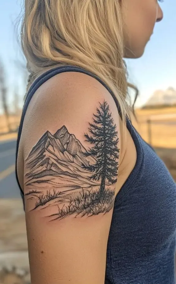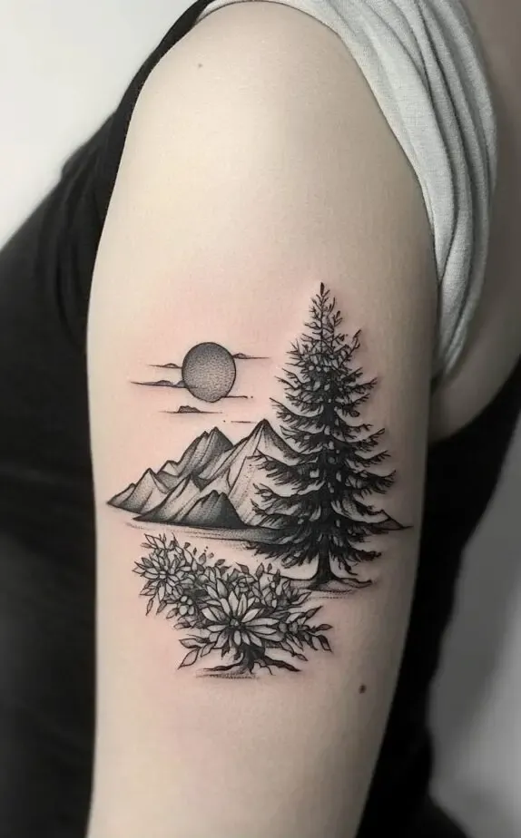 The pine tree represents growth and endurance, standing tall amidst the mountainous backdrop. This tattoo is symbolic of personal growth and the journey toward inner strength. The placement on the upper arm keeps it visible, serving as a constant reminder of one s grounded yet aspirational nature.