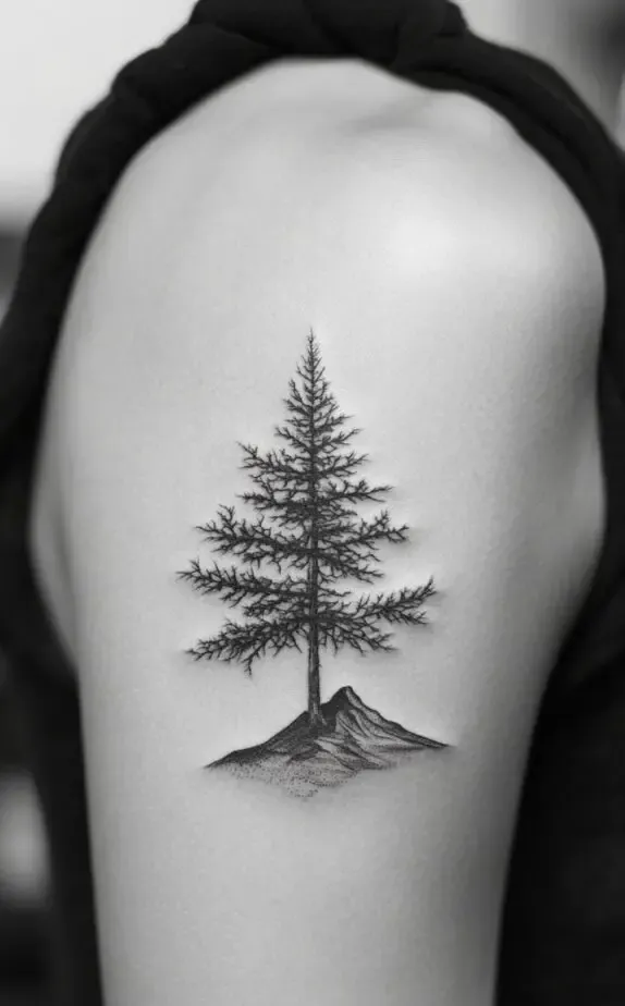 The second tattoo showcases a lone pine tree growing from a small mountain peak. This simple yet elegant design is perfect for those who appreciate minimalism. The clean lines and precise detailing make it ideal for individuals seeking a subtle nature-themed tattoo.