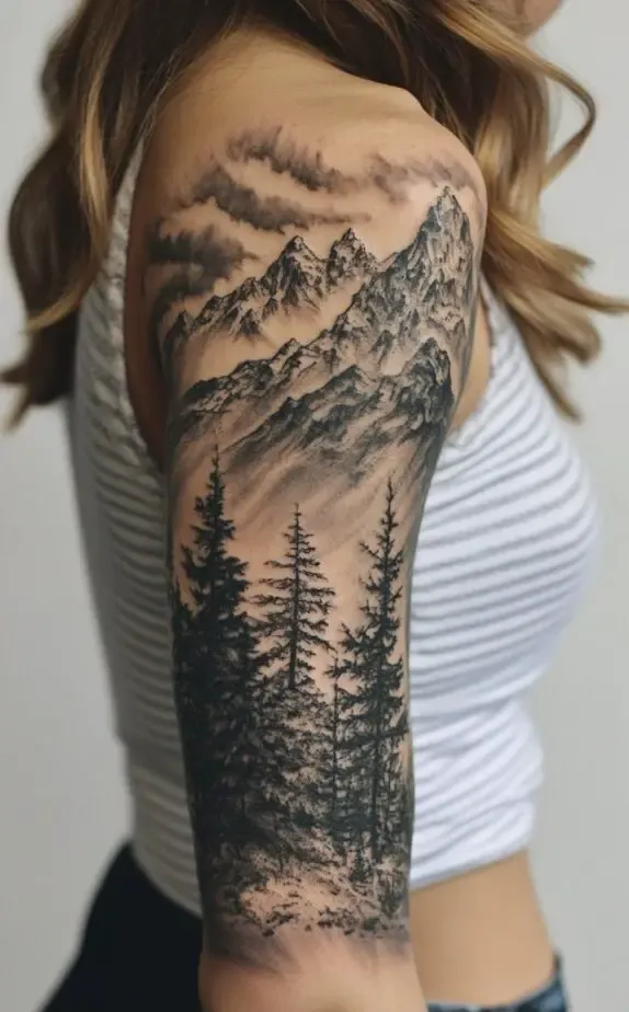 For those who prefer intricate designs, detailed landscape tattoos featuring mountains and trees offer a stunning way to capture the essence of nature. These tattoos can include shading, gradients, and fine lines to create depth and texture. Adding details like rivers, clouds, or wildlife enhances the scene, making it feel more alive and immersive.