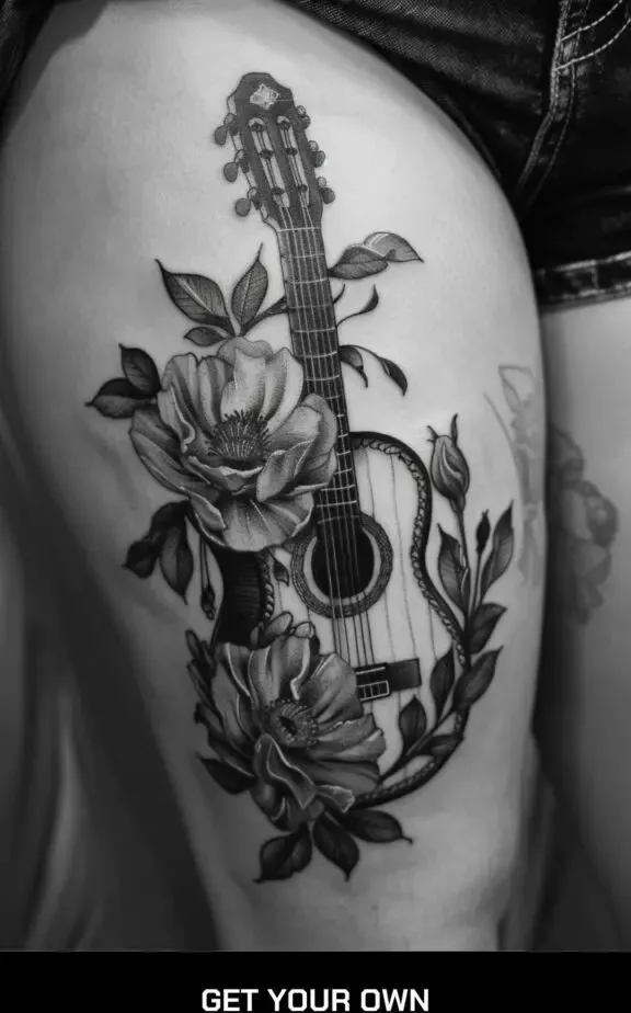 Guitar and flower tattoos blend the beauty of music with the elegance of nature. This design can symbolize harmony, creativity, and the delicate balance between art and life.