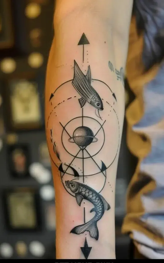 A tattoo featuring the image of two fish swimming in opposite directions is a bold representation of Pisces. This design can be stylized or realistic, capturing the essence of duality and flow. Common placements include the forearm, shoulder, or back.