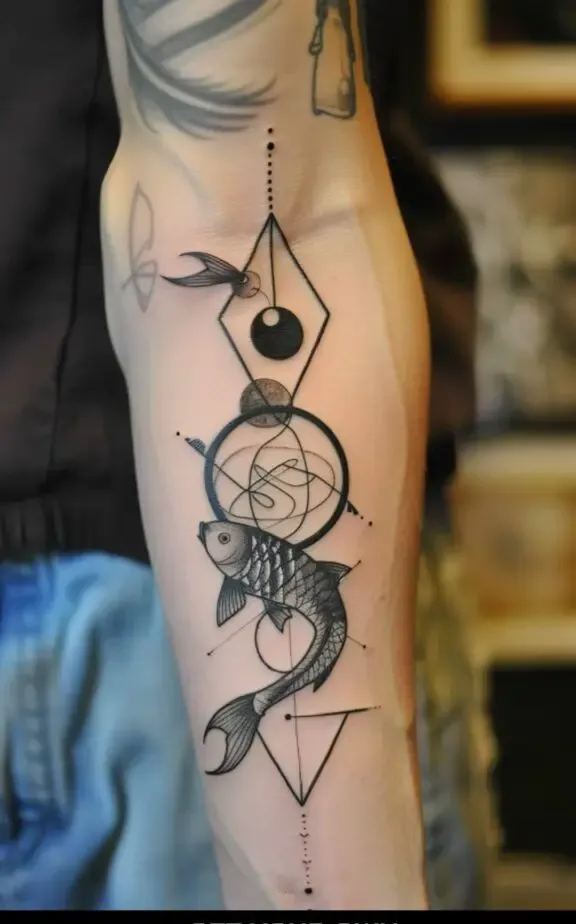 Geometric tattoos are modern and stylish, using clean lines and shapes to create a unique depiction of the fish. This abstract approach can be both artistic and symbolic, suitable for the forearm, thigh, or upper arm.