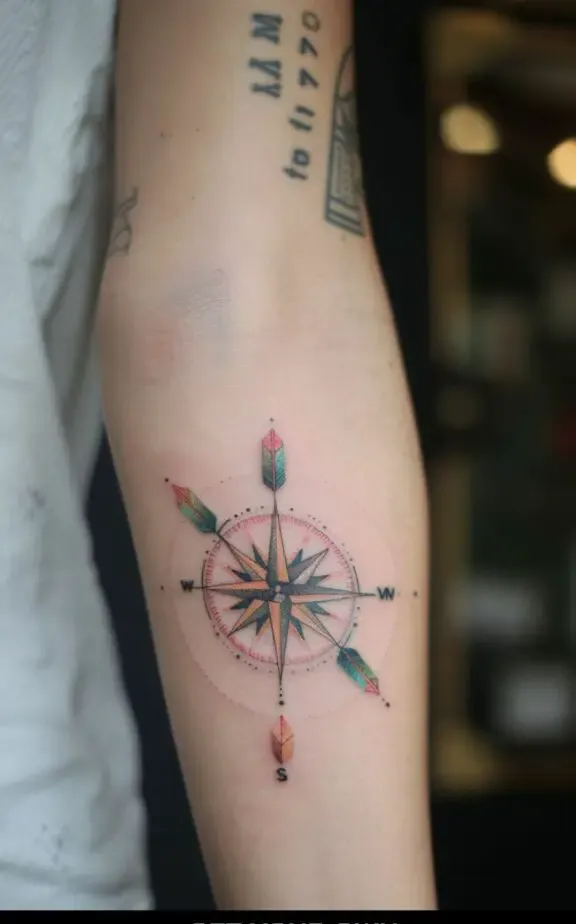A compass, symbolizing direction and adventure, paired with an arrow can represent your love for exploration and travel. This design can be placed on the back, chest, or thigh.