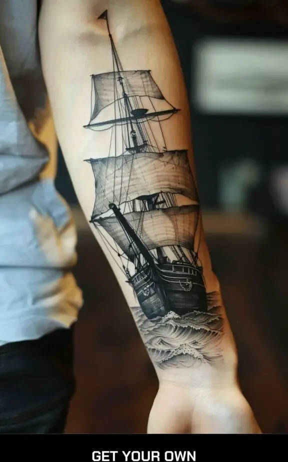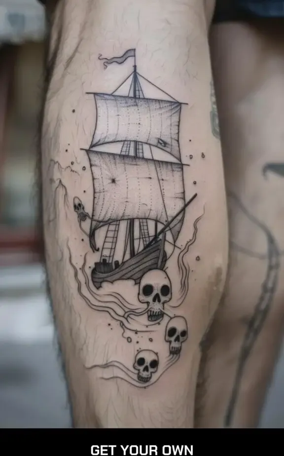 Pirate ship tattoos evoke a sense of rebellion and adventure. These designs often include pirate flags, skull and crossbones, and dramatic waves, creating a dynamic and thrilling piece of art.