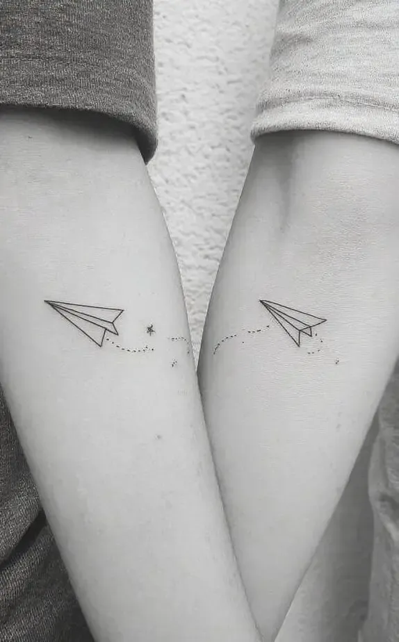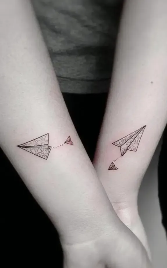Tiny paper airplane tattoos beautifully symbolize the enduring connection between best friends, even when separated by distance.