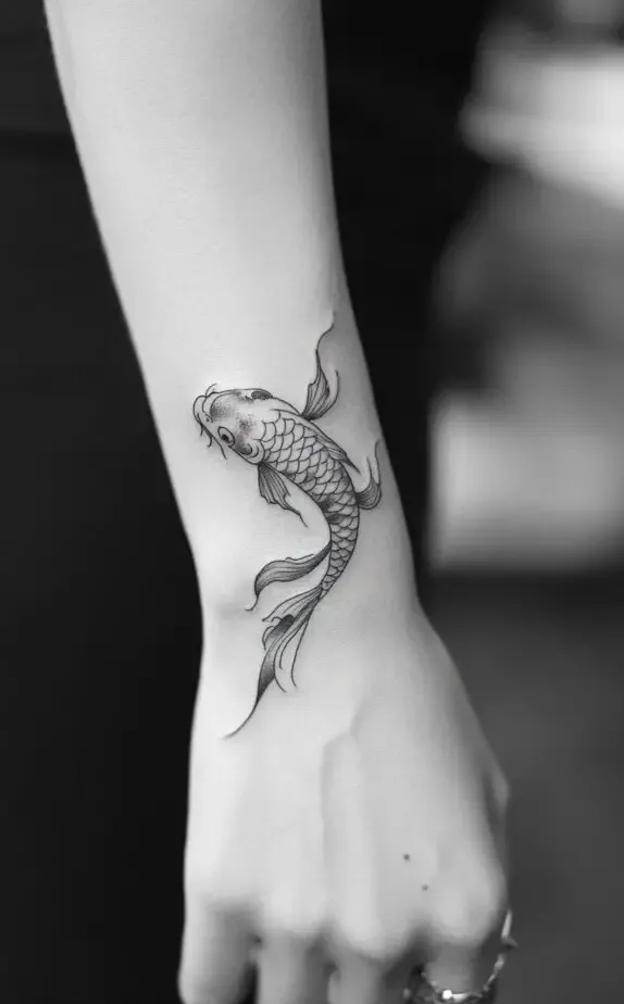 Koi fish tattoos are rich in symbolism, representing perseverance, strength, and good fortune. This delicate koi fish design showcases its elegance through smooth lines and subtle shading.