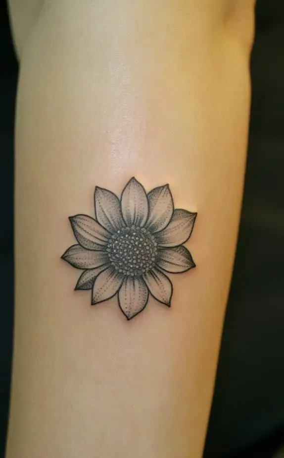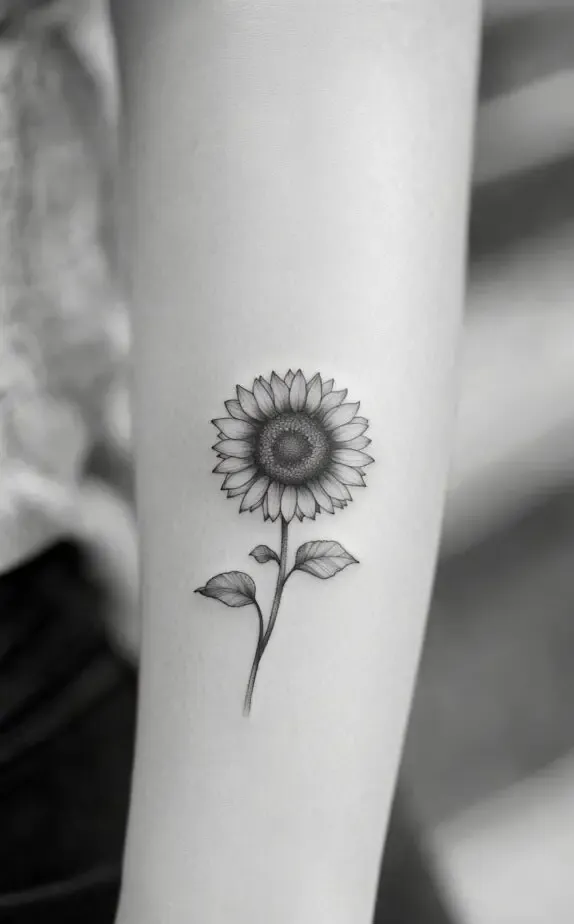 Sunflowers symbolize joy, loyalty, and adoration. This delicate sunflower tattoo, etched in fine black ink, captures these qualities in a minimalist yet elegant way. It s perfect for someone who radiates positivity and warmth.