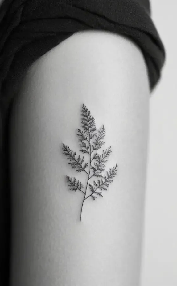 Ferns symbolize new beginnings, endurance, and humility. This tattoo s minimalist design captures the natural elegance of a fern leaf, making it a subtle yet meaningful statement.