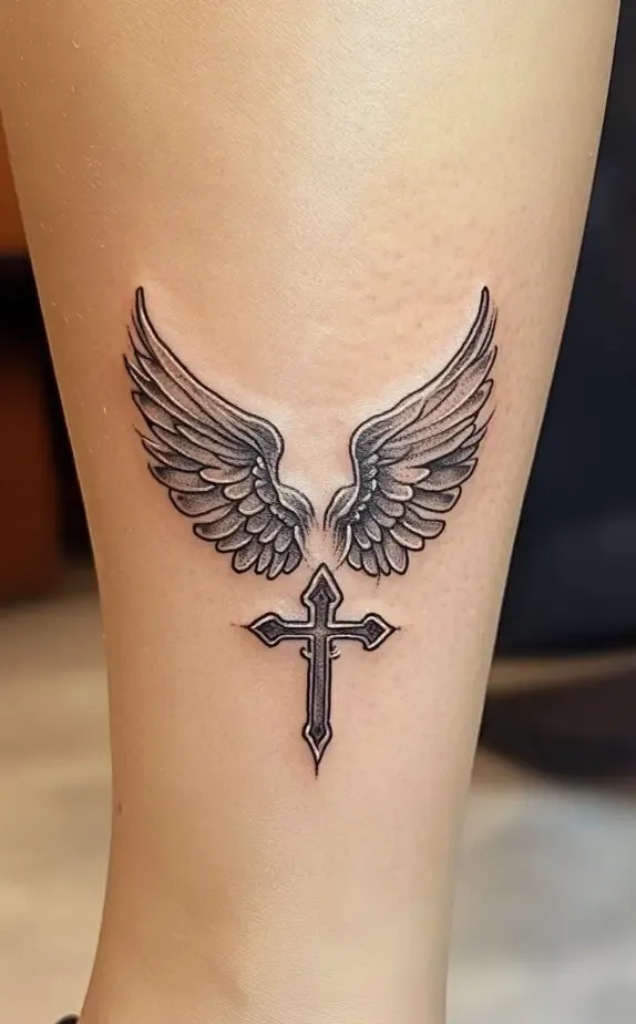 The intricate details of the wings add a touch of grace, while the cross represents a guiding force. Positioned near the ankle, it s discreet yet impactful.