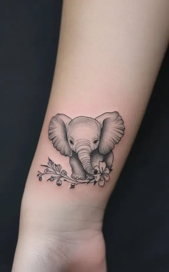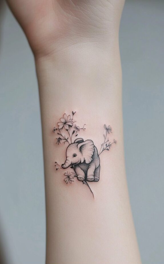 A variation of the elephant design, this tattoo adds playful flowers, symbolizing joy and prosperity. Its dainty style makes it a versatile choice.