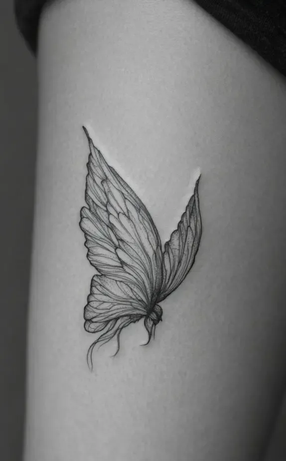 A butterfly tattoo represents transformation, freedom, and rebirth. This design s intricate linework highlights the ethereal beauty of a butterfly in flight, symbolizing a journey of self-growth.