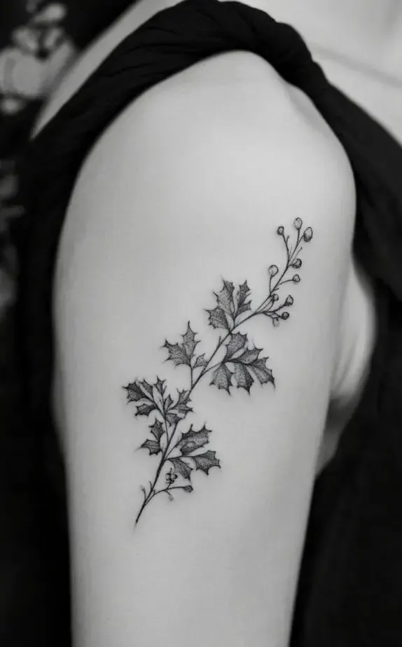 A holly sprig tattoo is a symbol of resilience, hope, and protection. Its delicate design with fine line details makes it a sophisticated choice for any occasion.