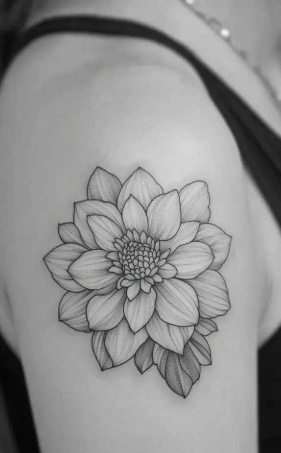 A dahlia flower represents grace, creativity, and inner strength. This tattoo s detailed petals create a stunning design that celebrates personal growth and resilience.