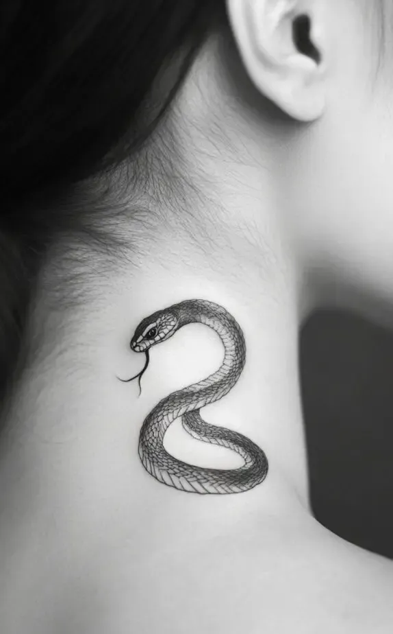 The snake tattoo on the nape of the neck represents transformation and rebirth. Its minimalist design and placement make it a subtle yet powerful symbol of resilience.