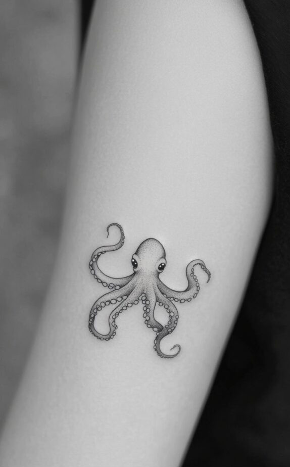 The octopus tattoo signifies intelligence and adaptability. Its whimsical design reflects the ability to handle multiple challenges at once.