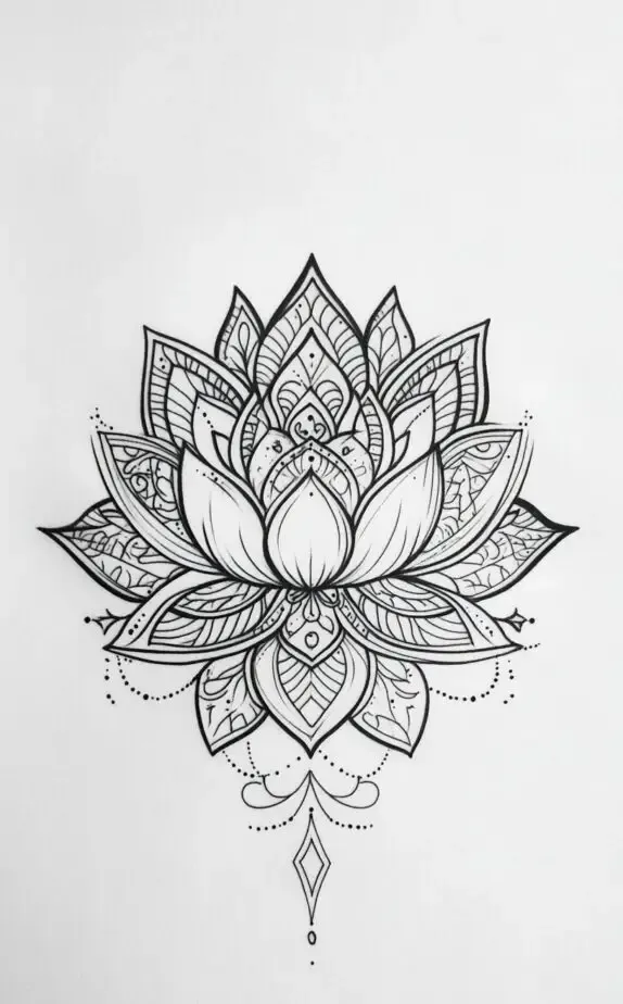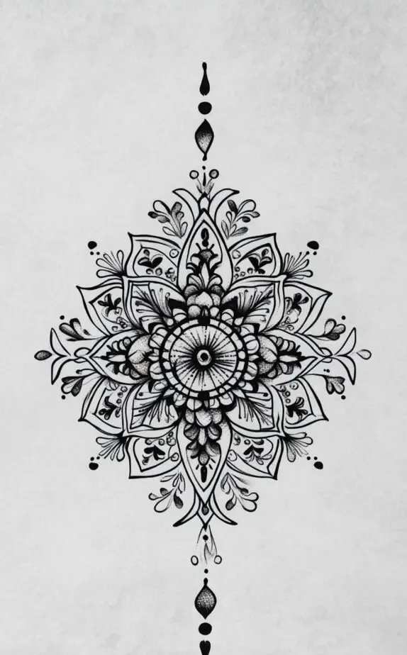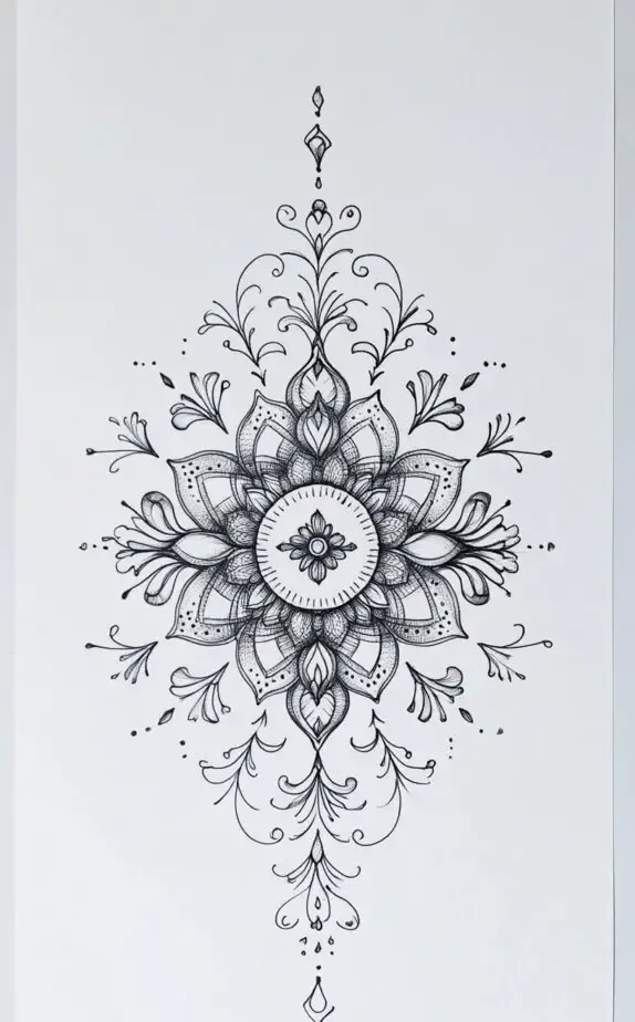 This mandala tattoo drawing showcases an intricate pattern that radiates harmony and inner peace. Each petal and line is meticulously crafted, making this design a wonderful choice for women who appreciate both artistry and symbolism. Mandalas are often associated with meditation and balance, making this an ideal piece for those seeking tranquility and wholeness in their lives. It would look stunning on the forearm or calf.