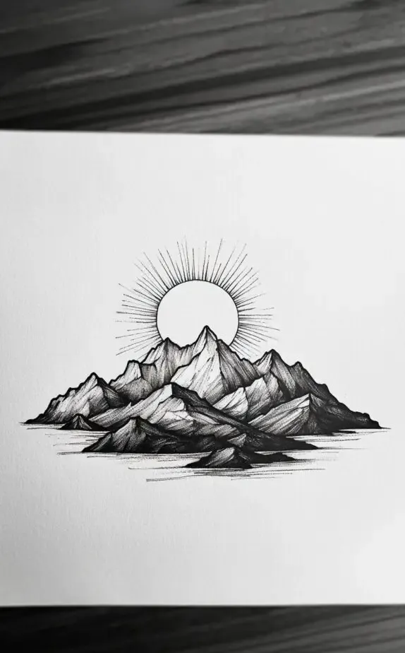 The mountain and sun tattoo represents strength, stability, and enlightenment. The mountain, unmovable and enduring, symbolizes resilience and the ability to rise above challenges. The sun behind it signifies clarity and hope, a beacon of light guiding the way. This minimalist design is ideal for men who connect with nature and view life as a journey of overcoming obstacles to reach new heights.