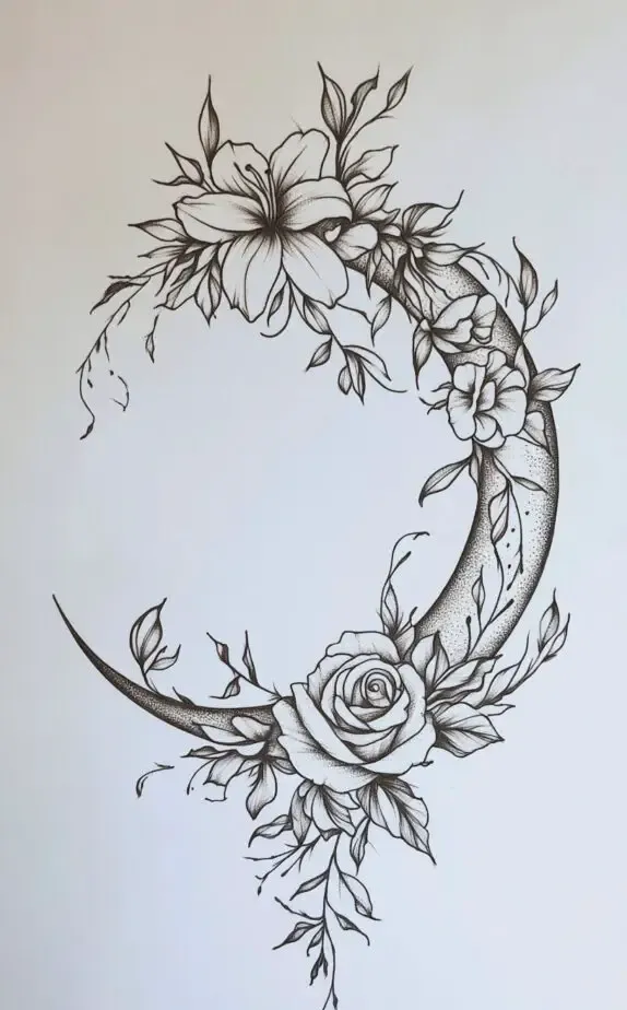 This crescent moon tattoo adorned with blooming flowers represents femininity, growth, and harmony. The moon, often associated with intuition and change, combines with the flowers to create a balanced, graceful design. It s a beautiful choice for those wanting a tattoo that reflects their spiritual side and love for nature.