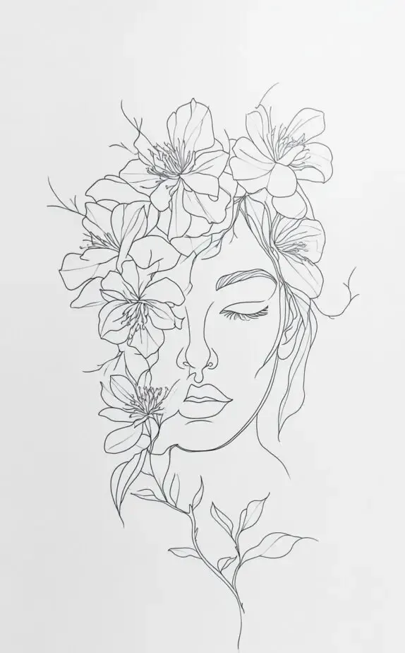 This design combines a delicate outline of a woman s face with blooming flowers, symbolizing beauty, strength, and femininity. It captures the essence of womanhood, blending nature with a minimalistic style. It s a meaningful tattoo choice for women who want to celebrate their inner beauty and resilience.