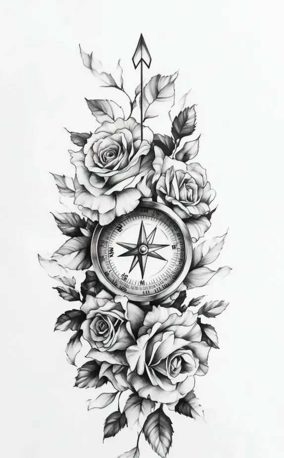 This tattoo design combines the timeless elegance of roses with the guiding symbolism of a compass. The compass signifies direction and purpose, a reminder to stay grounded and pursue one s path. The detailed, realistic shading of the roses adds a soft touch, making the piece visually appealing and balanced. This design is perfect for men who appreciate both classic aesthetics and meaningful symbolism, merging beauty and purpose in a way that tells a unique story about personal direction and growth.