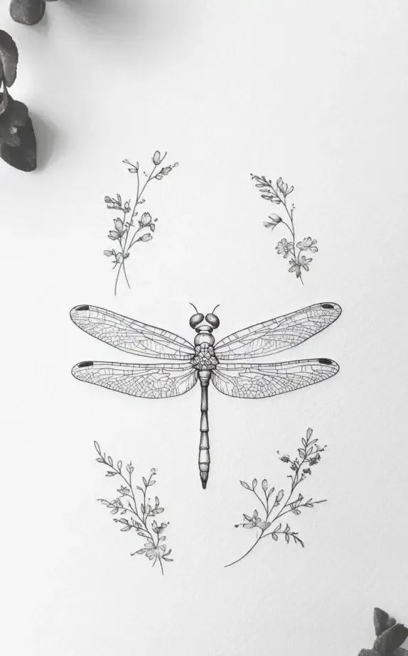 Dragonflies are symbols of change, adaptability, and transformation. This dragonfly tattoo, surrounded by tiny wildflowers, brings a touch of nature s beauty and harmony. Its delicate details make it ideal for a , capturing the essence of freedom and grace.