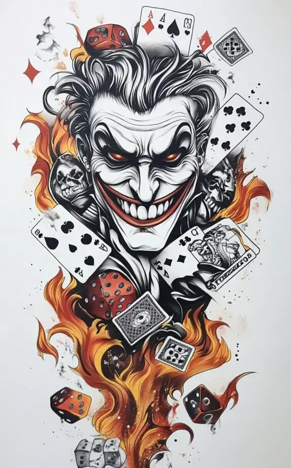 The joker tattoo captures the spirit of unpredictability and chance. Surrounded by playing cards, dice, and flames, this design symbolizes risk-taking, luck, and the darker side of playfulness. The intense gaze of the joker and the vivid details in the cards add depth, making it a striking choice for those who embrace life s uncertainties with a bold, rebellious spirit. It s a tattoo for men who live on the edge and aren t afraid to gamble with fate.