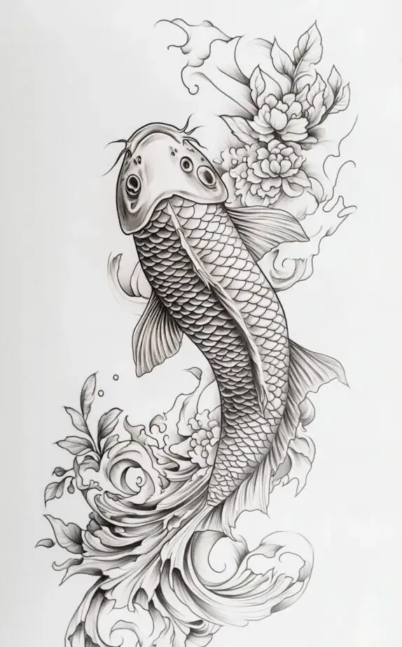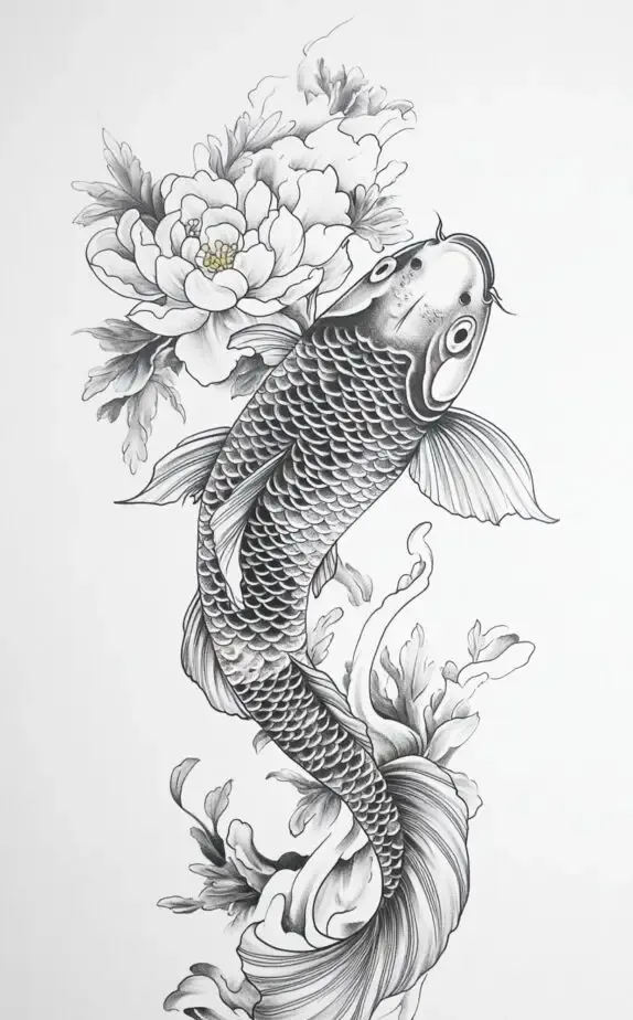 The koi fish symbolizes strength, perseverance, and luck, while the peony represents prosperity and beauty. This detailed design brings together the flowing movement of the koi fish with the delicate petals of the peony, making it a perfect tattoo for someone who values resilience and elegance.