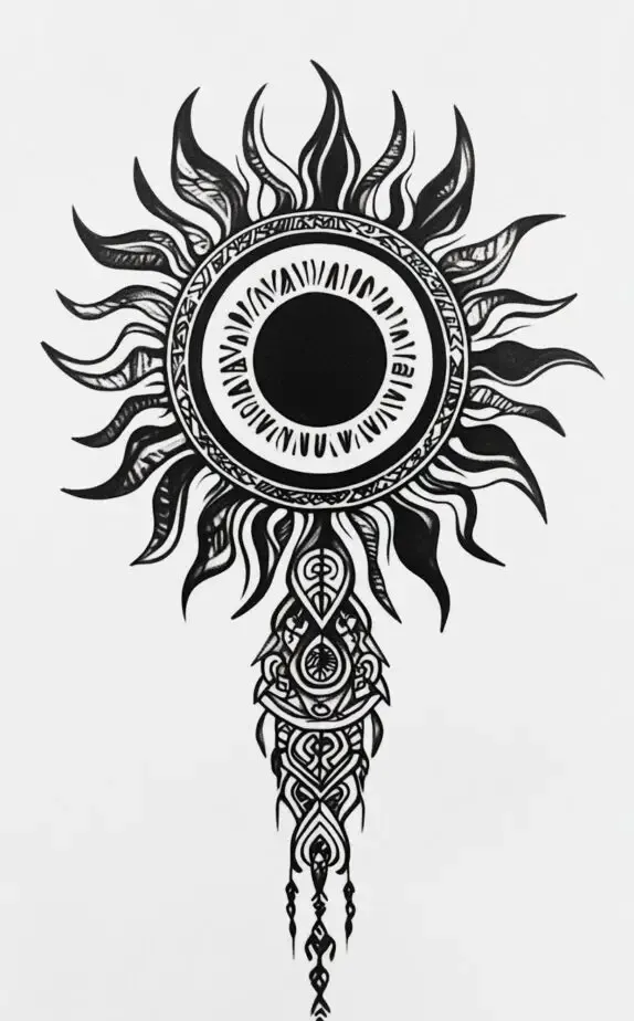 The tribal sun tattoo is a powerful symbol of strength, energy, and eternal life. Its bold, intricate patterns radiate outward, capturing the essence of ancient tribal art while also embodying a modern masculine edge. This tattoo represents an unwavering inner fire, resilience, and an unbreakable spirit. Ideal for men seeking a strong, iconic piece, this sun-inspired design draws on cultural motifs that highlight both individual strength and connection to primal elements.