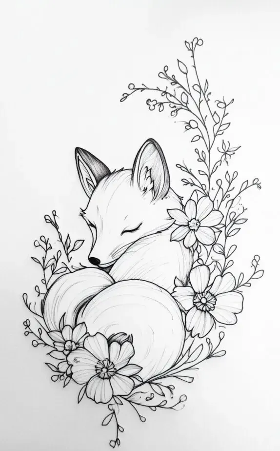 This adorable drawing of a sleeping fox nestled among flowers exudes a warm, gentle vibe. The fox symbolizes intelligence and beauty, while the surrounding flowers add a touch of femininity. This tattoo design is perfect for women who connect with the qualities of the fox, such as cleverness and adaptability. Its delicate lines and cozy look make it a lovely piece for the upper arm or shoulder.