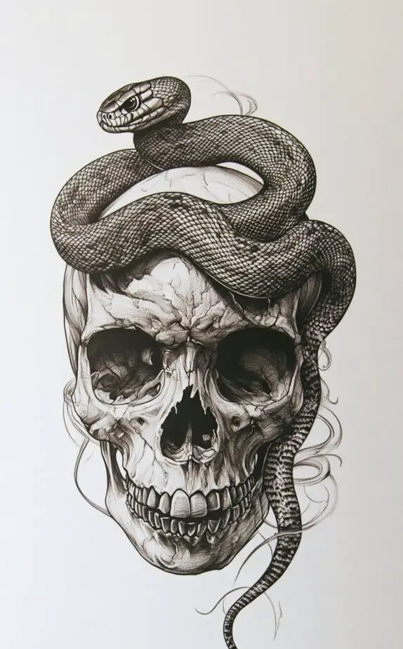 A skull wrapped with a snake brings together themes of life, death, and wisdom. The skull represents mortality, while the snake, often a symbol of rebirth, gives a sense of renewal. This tattoo design is perfect for men who acknowledge life s duality, embracing both its dark and light aspects. The snake s detailed scales and the skull s shadows make this a visually compelling piece.