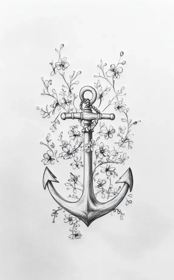 This anchor tattoo drawing, entwined with delicate flowers, symbolizes strength and stability. Anchors are often associated with staying grounded and secure, and the floral accents add a soft, feminine touch. This design is perfect for women who want to represent resilience and unwavering strength in the face of challenges. Ideal for placement on the ankle or inner arm.