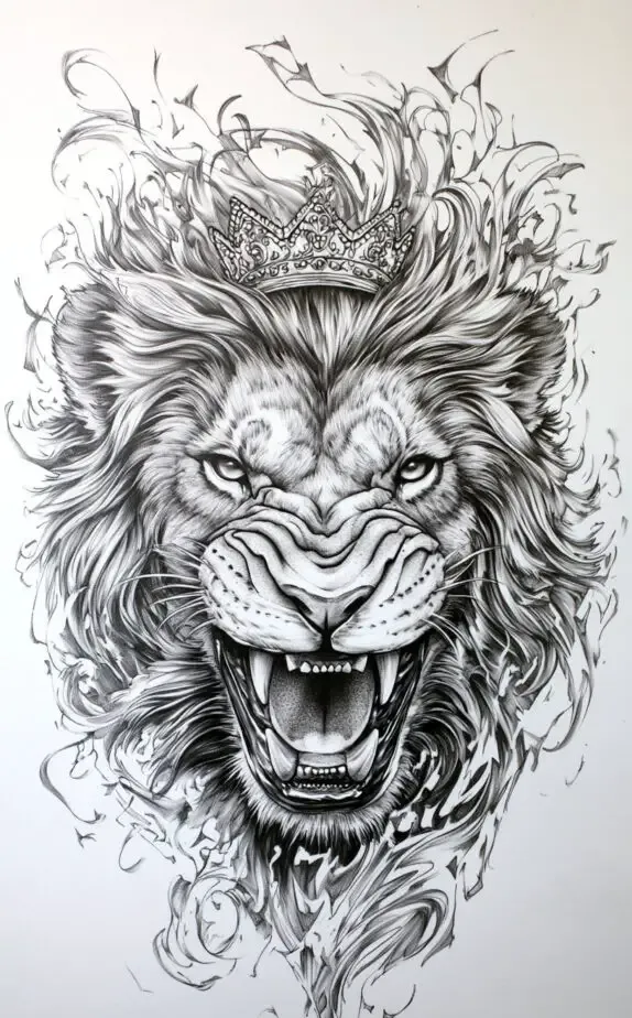 A lion tattoo symbolizes strength, bravery, and leadership, making it a popular choice among men. This design adds a crown, signifying royalty and dominance. The fierce expression and flowing mane of the lion bring out a powerful aura, perfect for those wanting a tattoo that showcases resilience and authority. The crown complements the lion s regal nature, making this tattoo ideal for anyone with a strong personality.