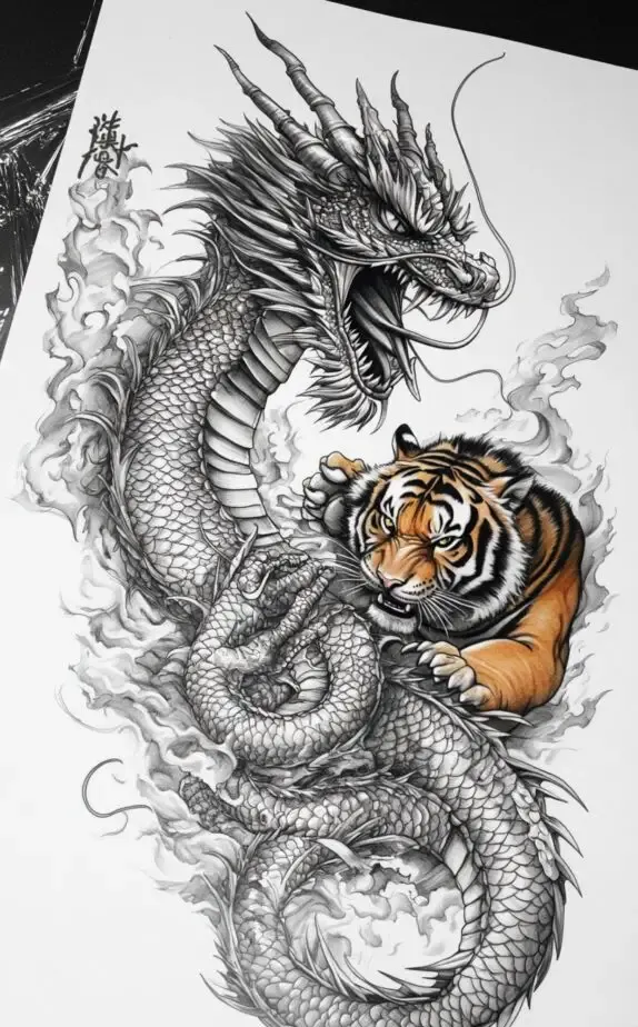 This tattoo features a dramatic confrontation between a dragon and a tiger, each a symbol of power and strength. The dragon represents wisdom and protection, while the tiger stands for bravery and courage. The detailed shading and intense expressions of both creatures make this piece visually compelling and vibrant. It s a powerful choice for those who want to convey inner strength and resilience, embodying the balance between wisdom and raw power.