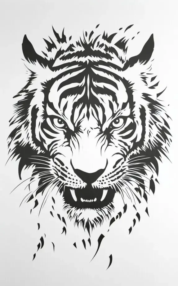 The tiger, a symbol of courage and ferocity, is illustrated here in a bold, black silhouette. This minimalist yet striking design captures the essence of a tiger s gaze, exuding an intense presence. With its sharp lines and focused eyes, this tattoo embodies raw power and independence, making it suitable for men who pride themselves on their fearless spirit and unyielding strength.