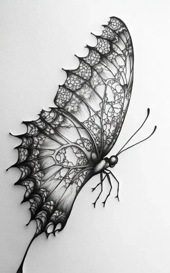 Butterflies represent transformation, beauty, and freedom. This lace butterfly design adds a touch of intricacy and femininity, creating a delicate appearance. Perfect for the forearm or back, it combines the charm of lace patterns with the lightness of a butterfly, symbolizing growth and renewal.