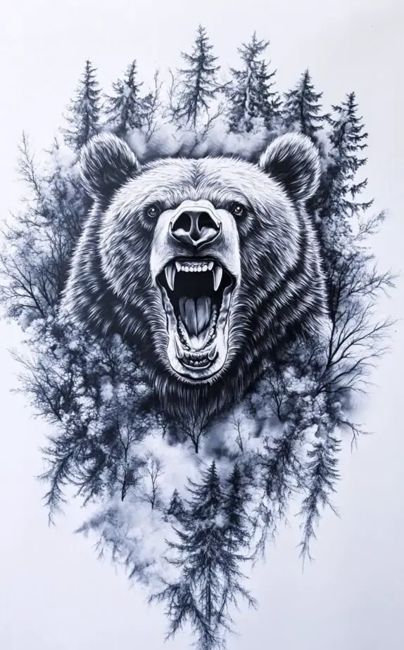 A bear surrounded by a forest represents strength, resilience, and a connection to nature. This tattoo captures the fierce nature of the bear, along with the calming essence of the surrounding trees. It s ideal for men who find peace in nature and value endurance and strength. The forest setting adds depth to the tattoo, making it a striking symbol of wild power and tranquility.