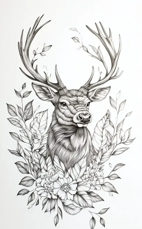 A deer tattoo represents grace, peace, and a deep connection to nature. This particular design combines the strength of the deer with soft, surrounding flowers and leaves. The detailed antlers and gentle expression give this tattoo a balance between masculinity and calmness. It s ideal for men who seek to convey their inner strength alongside a gentle spirit.